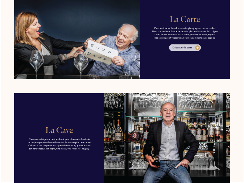 - Ambiance 1920s (typographie art déco, dorures, textures), photos immersives de la salle et des plats.